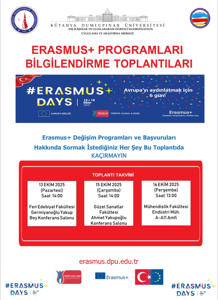 Avrupa Birliği’nin eğitim, gençlik ve spor alanlarındaki hibe desteklerini kapsayan Erasmus+ programının tanınırlığını artırmak, programdan henüz yararlanmamış kişileri Erasmus+ programından yararlanmaya teşvik etmek amacıyla yapılan #ErasmusDays bu yıl 13-18 Ekim 2025 tarihlerinde, dünya çapında farklı ülkelerde gerçekleştirilecek etkinliklerle kutlanacaktır. Söz konusu etkinlikler için üniversitemiz tarafından gerçekleştirilecek bilgilendirme toplantıları aşağıdaki tarihlerde yapılacaktır.